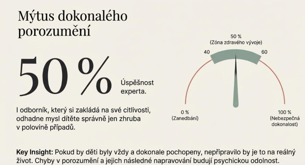 Mnoho rodičů prožívá úzkost, když svému dítěti nerozumí. Zde však přichází zásadní „aha moment“: Peter Fonagy přiznává, že se v odhadu vnitřního stavu dítěte trefí jen asi v polovině případů. A co víc – tvrdí, že je to tak správně (Fonagy et al., 2016, Mentalization-Based Treatment for Families).Tato padesátiprocentní úspěšnost je totiž klíčem k budování odolnosti (resilience). Kdyby rodič rozuměl dítěti vždy a dokonale, vytvořil by pro něj umělé prostředí, které ho nepřipraví na reálný svět. Svět venku je plný nedorozumění a drobných sociálních omylů. Právě skrze tyto momenty, kdy se „netrefíte“ a následně se snažíte porozumění napravit, se dítě učí, jak fungují vztahy a jak zvládat nejistotu.